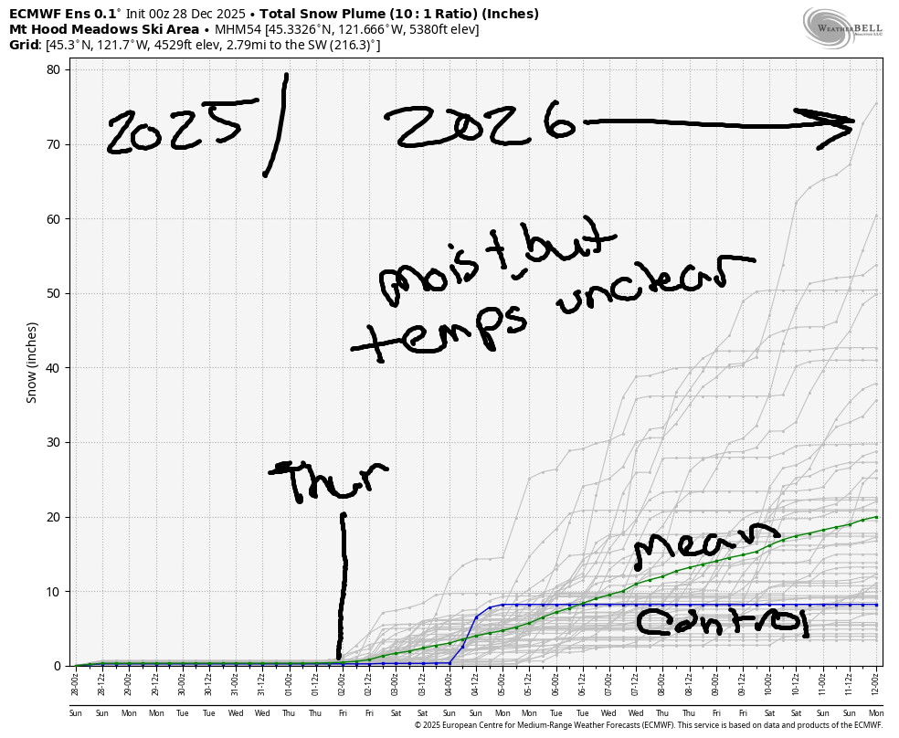 Our next system potentially arrives on Thursday. As of this morning, models don’t indicate all that much moisture, but they do indicate temps will be above freezing when that moisture arrives. Looking deeper into the future, we have the GFS calling for mean 850mb (~5000′) temps to hover right around 0C/32F for the extended period. The Euro has a wider range of possible temps (more uncertainty), with the mean below freezing next weekend and then rising above freezing after that starting around the 6th of January.