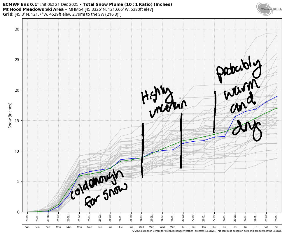 Coming up this week, we have approximately a foot of new snow total in our Mt Hood snow forecast. On Wednesday, models are all over the place about an incoming system. Temps at 850mb (~5000′) are forecast to be anywhere from -2.5C to +2.5C, so it’s impossible to say what precip type arrives with that system. Temps cool Thursday and rise again as the weekend approaches. That rise (and dry weather, thankfully) is in response to a multi-day ridge of high pressure. Beyond that, models have quite the spread of possibilities, but the general picture is cold with moderate snowfall. Let’s cross our fingers that the cold part of that forecast continues!
