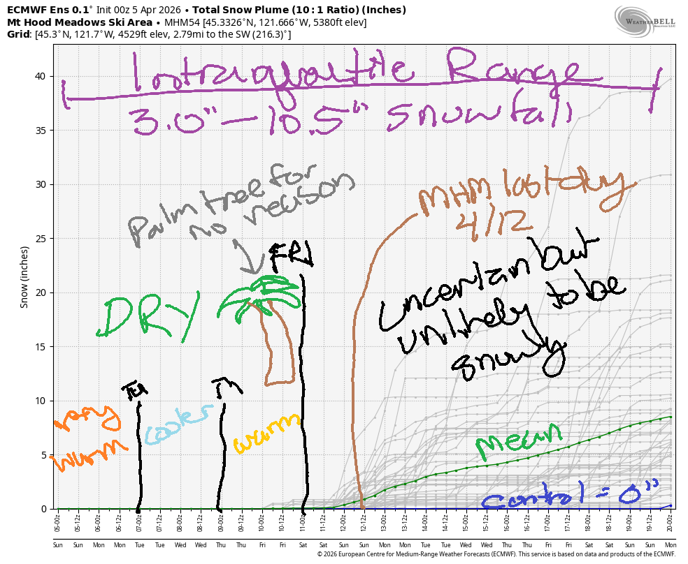 Hey skiers and snowboarders! Ski season is winding its way down, but that doesn’t mean you shouldn’t get in some laps! Get some laps before it’s gone! Meadows opened Superbowl for hiking yesterday. That’s always a treat and an excellent workout, as good as skate skiing and a worthy substitute now that Nordic is done for the year. Looking at the next week or so… we have warm weather for much of it, cooler weather (with good skiing likely) Tuesday and Wednesday, and warm weather again to close out the week. Uncertainty rises next weekend with some possibility for more active weather. Intraquartile range for snowfall through 4/20 is 3.0”-10.5”.
