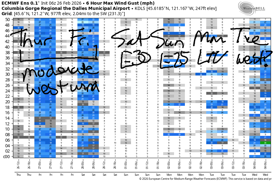 Saturday sees easterlies return. The day starts with 20mph at Stevenson and 15mph at Iwash/Rooster Rock. The wind rises to 25-30mph at both locations mid-morning before dropping to 20-25mph in the afternoon. High temp: 51F with mostly cloudy sky. On Sunday, easterlies linger: the day starts with 30mph at the usual spots and drops to 15mph. High temp: 57F (!!!) and sunny. Monday looks light easterly. High temp: 60F (!!!) and sunny! Have fun on the river, friends