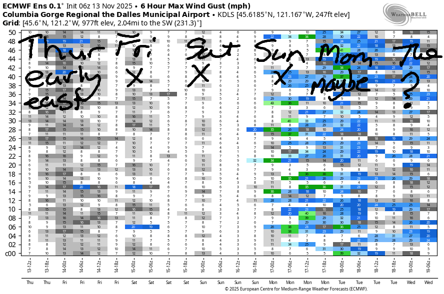 Looking at Thursday, we have a cloudy, aurora-blocking start. Drizzle is falling. Drizzle transforms to rain. We’ll have moderate rain to The Dalles by sunrise and east to Boardman shortly after. Rain tapers off this afternoon leaving us under mostly cloudy sky all across the land. Snow level: 10,000′ despite some weird sleet-like stuff in High Prairie this morning. In Glenwood this morning, it was 43 degrees. If you add 4+3 you get 7. All you have to do now is look around to find a 6. SIX SEVEN!!! Temps today max out in the mid 50s. Wind will be annoying near Iwash (RELEASE THE FILES!) Rock early: 45mph, but it will drop to 20-25mph midday and turn light westerly this evening. Stevenson: 25-30mph early but relief is in sight: the wind shuts off this afternoon.