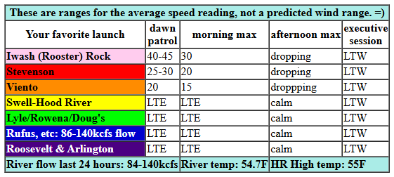 All that said… we started the day with westerlies in the teens to low 20s under the clouds and mid 20s near Rufus with teens farther east. For the morning, we’ll have clouds on the west side with 17-20 from Stevenson to Viento, gusty 14-17 from Swell to Mosier (a short period of 17-21 is possible), and 22-25 from Lyle to Rufus. For the afternoon, the Stevenson to Hood River zone will be gusty 16-20ish. From Mosier (or maybe Lyle) to Rufus, westerlies rise to 27-31. Arlington may also join at that pace, but it may also be in the 23-26 range along with Threemile. Remember that those eastern Gorge sensors read high compared to Swell – 23-26 out there is like 19-22 at Swell. River flow over the last 24 hours was 210-253kcfs, river temp is 54.5F, and high temp forecast is 61F at both Hood River and Arlington.