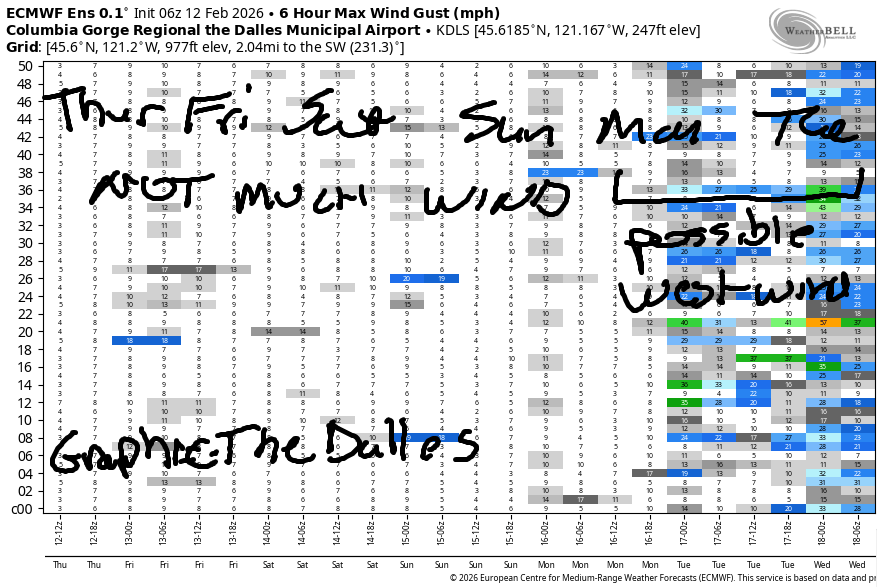 For Thursday, today, we start with light easterlies at 5-10mph west of Hood River. Afternoon wind switches direction, but is unlikely to be strong enough to get you on the water. Expect west wind at 11-14mph this afternoon from Stevenson to Arlington. River flow over the last 24 hours was 140-178kcfs, river temp is 41.4F, and high temp forecast is 51F with intermittently cloudy sky after a mostly clear start.