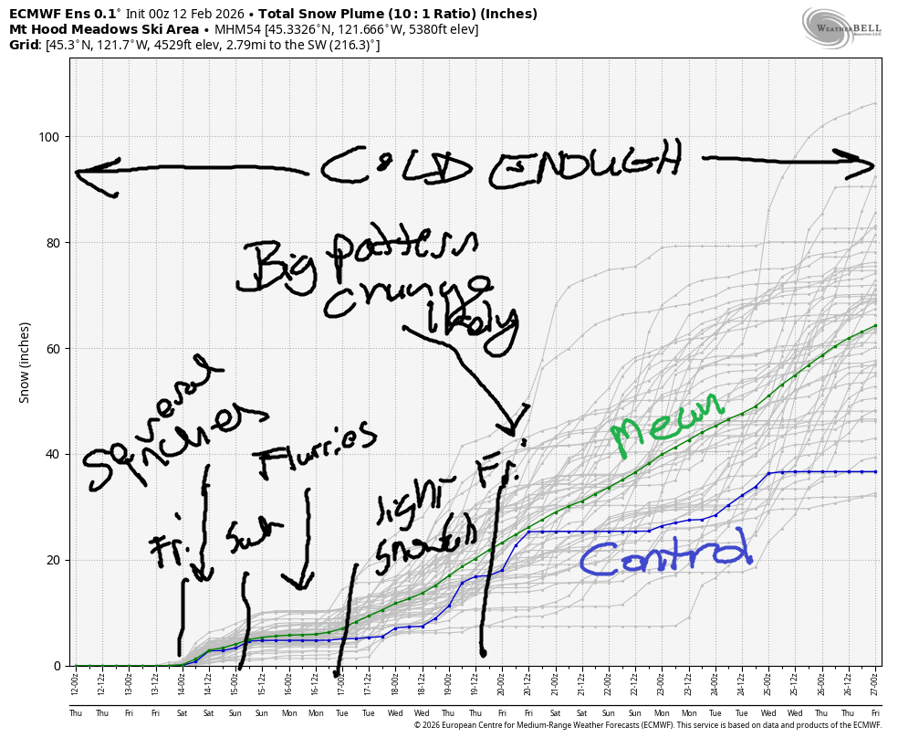 Hey skiers and snowboarders! Timberline, Meadows, and Teacup are still holding it together, and there’s good news in the forecast, even for lower-elevation Skibowl. Cool, dry weather sticks around for a couple more days, and then we fall into a cooler period of light (maybe more?) snowfall that continues on and off through much of next week. At the end of next week, models insist on a big pattern change to colder, much wetter weather that should give a decent boost to the snowpack. Through the middle of next week, we’re expecting a total of 10-18” of new snow. Through the 27th of February, that jumps to 53.4” to 72.6” for the intraquartile range with 5-8” snow water equivalent. Yay!