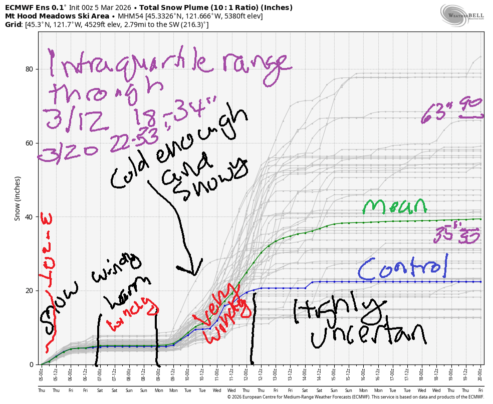 Generally speaking, the Mt Hood snow forecast brings light snowfall into midday Friday when very light drizzle replaces the snow and sticks around into Sunday morning. Snow returns Sunday night with the potential for heavy snowfall next week. The intraquartile range through 3/12 (when there’s decent model agreement) is 18-34”. Through 3/20 (highly uncertain), we have 22-53”.