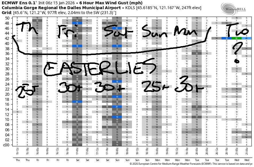 Friday brings a similar setup with a somewhat colder, denser, higher-pressure cold pool in the desert. If the easterlies stay below the Cascade Crest (and they’ll probably spill over some), we’ll see morning easterlies at 35-40mph at Stevenson and 50mph at Iwash with 20-25mph at Viento. Easterlies drop to 30-35mph at Stevenson in the afternoon but basically hold elsewhere. High temp: 45F with Nothing to the east and sun to the west.