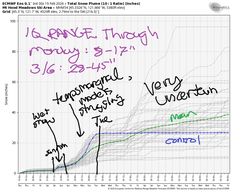 Hey skiers and snowboarders! I was lamenting with my boss this morning that we seem to have broken the planet – it’s been quite warm, and in an interesting twist, the forecast models do not seem to be handling the “new normal” all that well. You may have notice we haven’t been hitting our two-week targets for the intraquartile range. Or maybe you haven’t noticed, but I sure have! Looking into those models… we have light snowfall through Sunday followed by warmer weather with the potential for an atmospheric river sideswipe in the Monday-Tuesday time frame. Models call for 9-17” snow through Monday and 28-45” snow through March 6th.