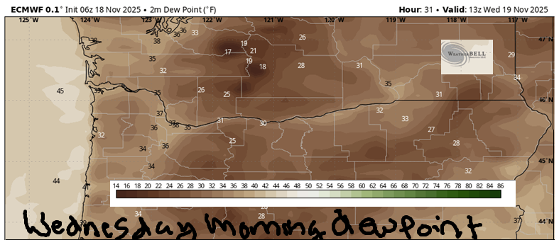 For the rest of us, Tuesday started off with a long-lasting and multi-layered sunrise. That’s long gone, and we now have high clouds. A weak trough swings through today with a period of increased clouds followed by clearing from west to east. Timing looks good for a colorful sunset! Temps rise to 50 (west) and 52 (The Dalles) today with west wind at 5-10mph all day long.