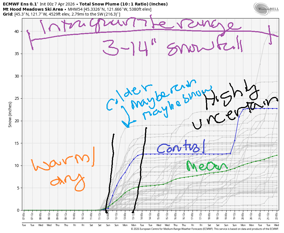 Cooler, potentially showery weather is forecast for the weekend. It’s not clear yet if we’ll see rain or snow showers or a mix of both; yesterday’s model runs actually called for some snow. Today’s deterministic GFS calls for rain showers, and the Euro is leaning towards snow. So… no clear outcome yet. It will be the last Meadows weekend for the season, so get up there either way! See you on the snow soon!
