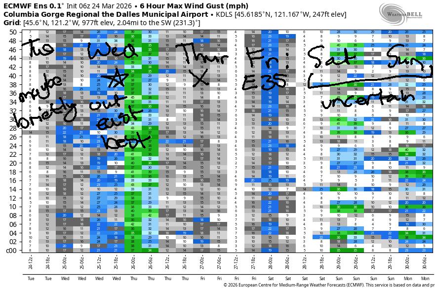 Another weak system moves through on Wednesday, and strong offshore high pressure builds behind it. Morning wind will be 7-10mph west of The Dalles and 15-18mph east of The Dalles all the way to Boardman. Afternoon sees Stevenson-Hood River climb to gusty 15-18 (a short period of stronger wind is possible if the clouds burn back more than expected). From Mosier to Boardman, the wind slowly builds to 28-31mph. High temp: 53F in Hood River (rainy until 8pm) and 60F out in the desert with mostly clear sky.