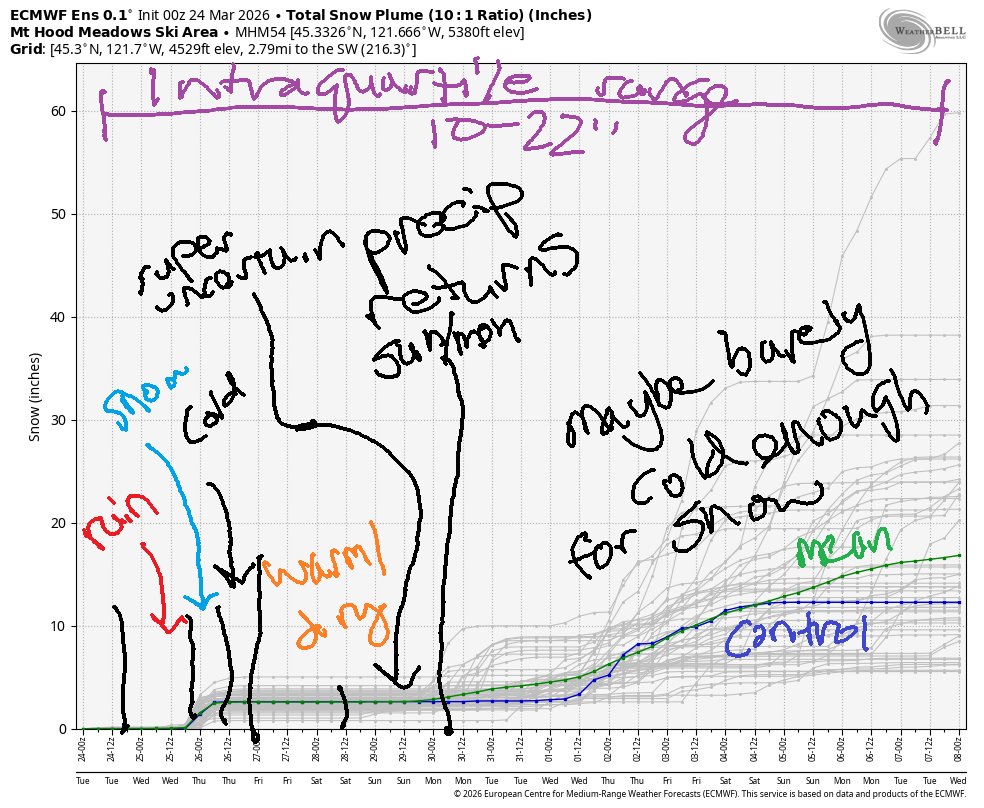 Friday starts sunny and turns high overcast. The freezing level rises to 10,000′ in the afternoon after starting around 6000′. That puts high temps at 5000′ around 442F. Wind will be light and variable all day. Model spread amplifies for the weekend, and it’s impossible to say for sure what will happen. It does look like some precipitation (not a ton) may arrives sometime on Sunday. Beyond that: cool and showery for the next week or so with quite a bit of uncertainty around both temps and precipitation quantity. Intraquartile range for snowfall through April 8th is 10-22”. See you on the snow!