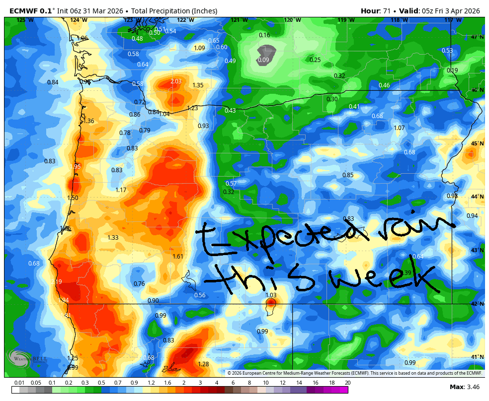 Rain moves in overnight. By 12:01AM on Wednesday morning, rain will make it to Hood River. By 2:01am, the rain skips The Dalles and extends to the Tri-Cities. From 2am to 11am or so, even South Wasco, Sherman, and Gilliam Counties see some drizzle! Heavy rain pummels areas west of Hood River from 5am to 2pm (not a fun drive!). That heavy rain shifts east in the afternoon and extends all the way to the Tri-Cities (not a fun drive!). After 8pm, areas east of The Dalles start to dry out. Areas west of The Dalles hold on to some lingering showers. Up in the mountains, snow will accumulate on the passes especially in the evening. Daytime wind in the lowlands maxes out at 20mph near Stevenson and Iwash (pen*s) Rock before turning light westerly in the afternoon (which makes rainbows) and increasing overnight. High temps: 51F to the west, 55F in The Dalles, and 57F in the desert. That’s after lows near 40F thanks to cloud cover.