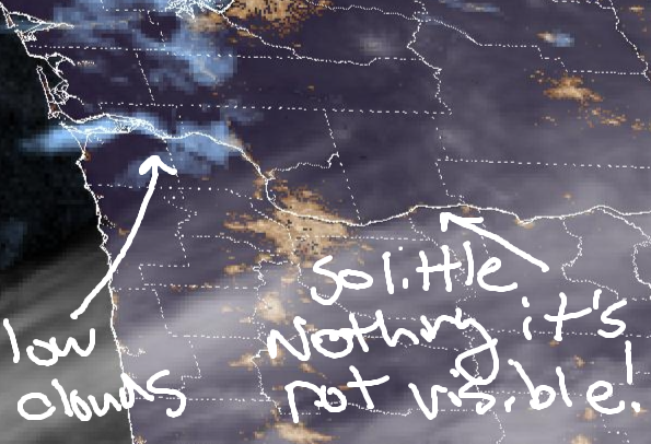 Another partial Nothing is forecast Thursday, but it’s quickly replaced by mid and high clouds that stretch all the way out in to the desert. Despite this, we’re still expecting high temps near 50F after a low-mid 30s start. Wind will be calm in the morning and west 15mph in the afternoon.
