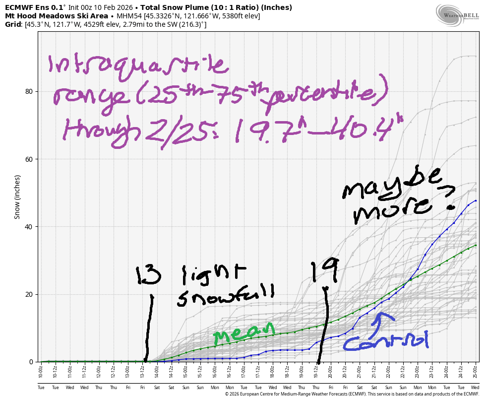 Hey skiers and snowboarders! There might not be a ton of new snow on Mt Hood, but it sure looks prettier than it did before the recent snowfall! Upcoming: a mild, but cool, week of dry weather with a shift to light snowfall on Friday afternoon. Models give us 3-7” total snowfall through the weekend, light snowfall next week, and then the potential for heavier snow starting around the 19th. Please do cross your fingers – it seems like these long-range forecasts have been erring optimistic this year. Intraquartile range between now and 2/25 is 19.7” to 40.4”.