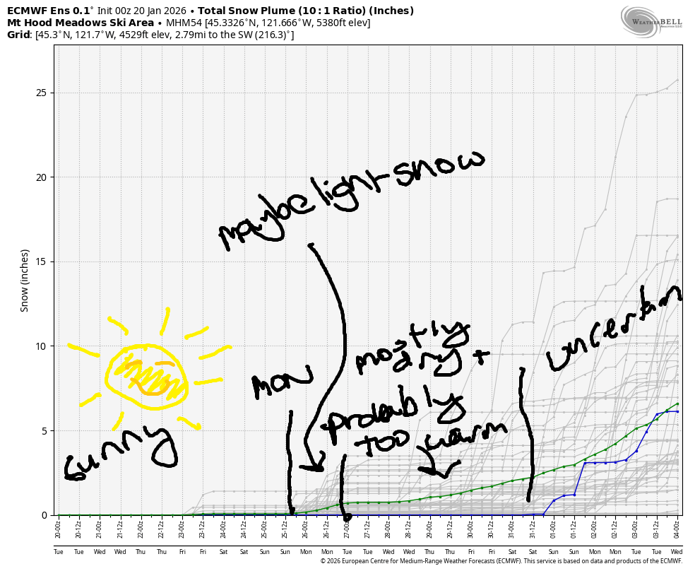 Hey skiers and snowboarders! Sunny weather continues on the slopes through the rest of this week and potentially into the weekend. Models suggest this pattern will break down next Monday. It’s possible we could see a little snow then before another period of mostly dry, rather mild weather settles in to the Pacific Northwest. One of the best ways to look at snow potential over the next couple of weeks is the intraquartile range, the 25th percentile snowfall to the 75th percentile. It’s not pretty: 2.4” to 9” of snowfall on Mt Hood through February 3rd. That’s not much, eh?