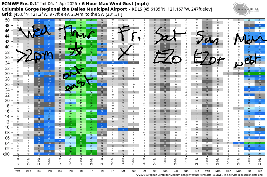 Looking at Wednesday, we started with basically flat gradients (29.68-29.69) and light/variable wind. Easterlies rise to 15mph at the usual spots (Iwash, Stevenson, Viento, Home Valley) midday. As a cold front swings through mid to late afternoon, westerlies return. We’ll have gusty 14-17mph from Stevenson to Doug’s (perhaps more, briefly, at the Hatch and Viento) with gusty 18-22mph from Avery to Arlington. After 5pm, the wind picks up more east of The Dalles, with gusty 20-25mph likely. River flow over the last 24 hours was 209-242kcfs, river temp is 47.1F, and high temp forecast is 52F and rainy in Hood River.