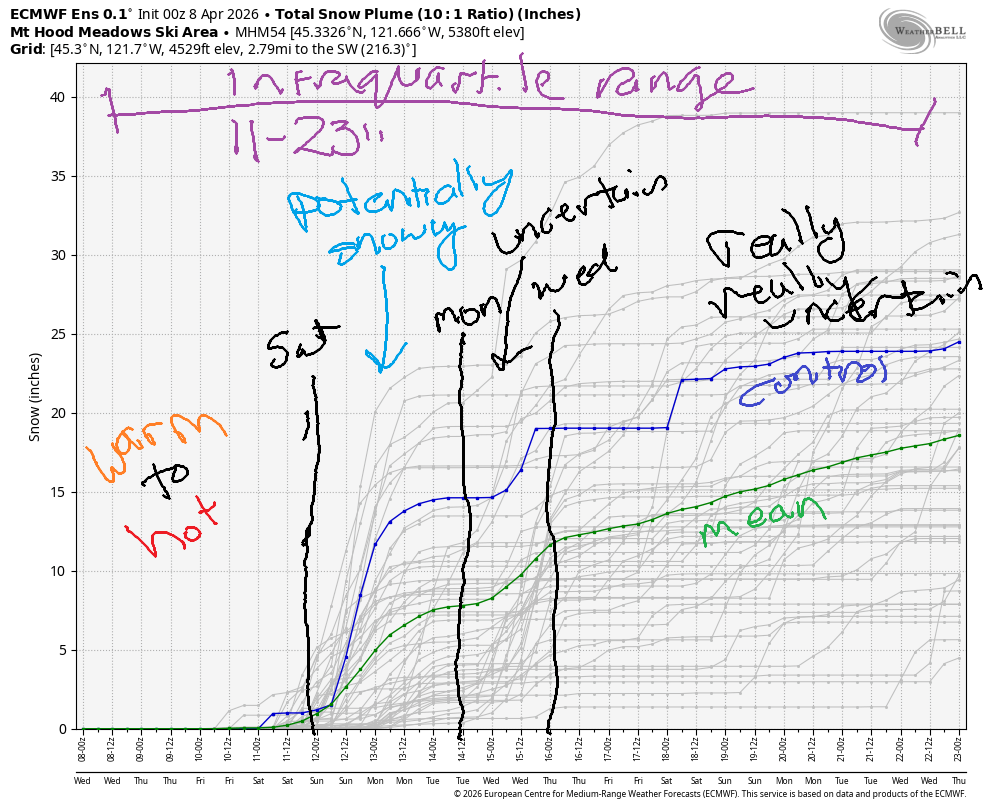 Hey skiers and snowboarders! Mostly sunny, warm weather continues on Mt Hood through Friday. For the weekend, we’ll have cooler weather with intermittent clouds and a chance of a little drizzle. Cooler weather continues through the early part of next week when a little snow is possible. The intraquartile range through April 23rd has jumped to 11-23”. Too late to save ski season, but a nice addition to the snowpack if it happens.