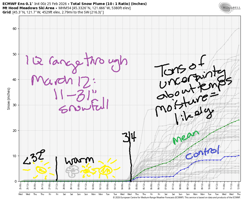 We’re in the company of these years: 2015 (when I rode my bike over Vista Ridge – 4000′ – in March), 2005 (almost as bad as 2015, which was the driest of all), 1981 (it recovered a bit), and 2003 (came close to average at the end). Of note with ’03 and ’81 is that it stayed cold and kept snowing into May, something we haven’t seen in the last 5 years or more. Anyway… Models keep us dry until March 4th or so, and then they offer up precipitation but no certainty around temps.