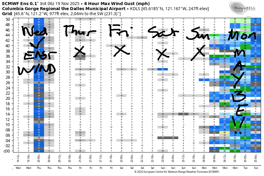 Overnight, a weather system makes landfall. This gives us drizzle as far east as Celilo Village starting around midnight and ending around sunrise. There’s a good chance you’ll sleep through the entire round of drizzle! Temps Thursday morning will be in the upper 30s. They’ll rise to 50-53F in the afternoon. Wind: unexciting. E 15mph in the usual spots in the morning and calm in the afternoon. Friday, Saturday, and Sunday all look uneventful. Calm wind, dry weather, temps in the low to mid 50s, warmest on Saturday. Our next weather system presents itself on Monday, but the timing, intensity, and exact type are still fuzzy. Generally speaking, the weather remains far from the extremes for the next week or so. Safe travels. -TATAS